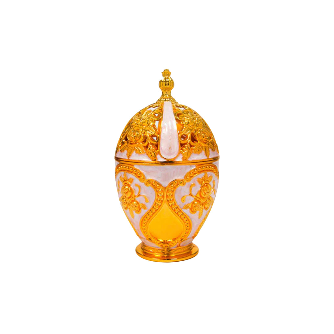 Bring a taste of the middle east and surround yourself with the relaxing aromas of Bukhoor with this luxury perforated gold metal burner with shimmering cream enamel glaze, adorned in gold florals, and a removable lid, and a perforated tray for burning coal.