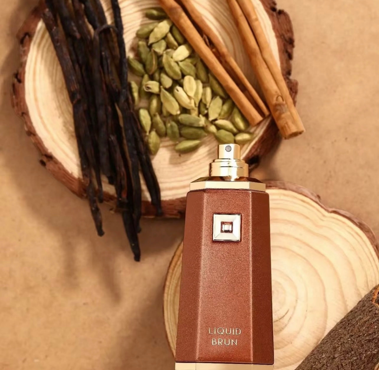 At the outset, Liquid Brun opens with a vibrant blend of Cinnamon, Bergamot, Cardamom, and Orange Blossom. The warm spice of Cinnamon mingles with the fresh and zesty notes of Bergamot and Cardamom, while the delicate Orange Blossom adds a touch of floral elegance, creating an invigorating and inviting introduction.