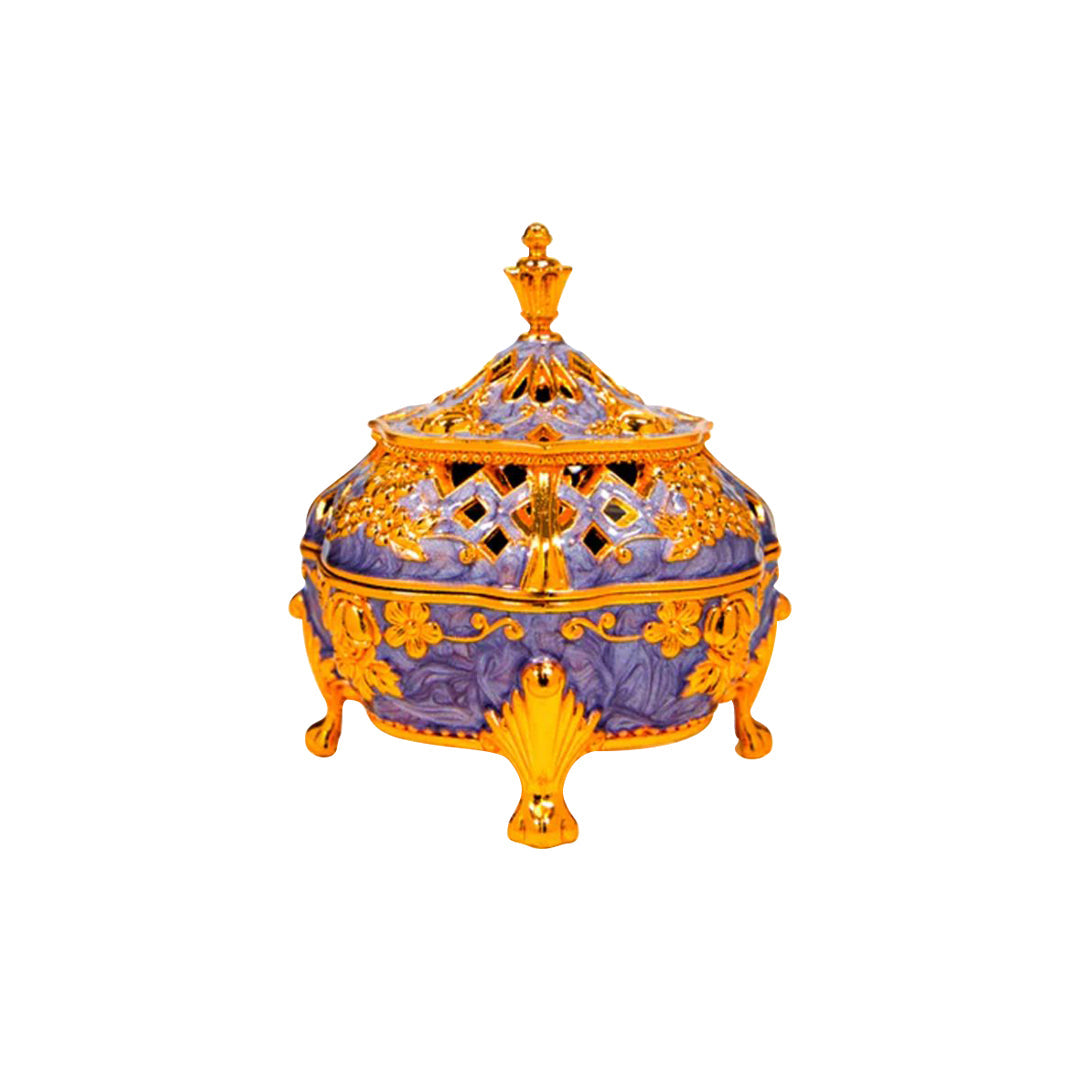 Bring a taste of the middle east and surround yourself with the relaxing aromas of Bukhoor with this perforated gold metal burner with Lilac enamel detailing. Adorned in gold, this burner sits on a pedestal legs, with a hinged lid and perforated tray for burning coal.